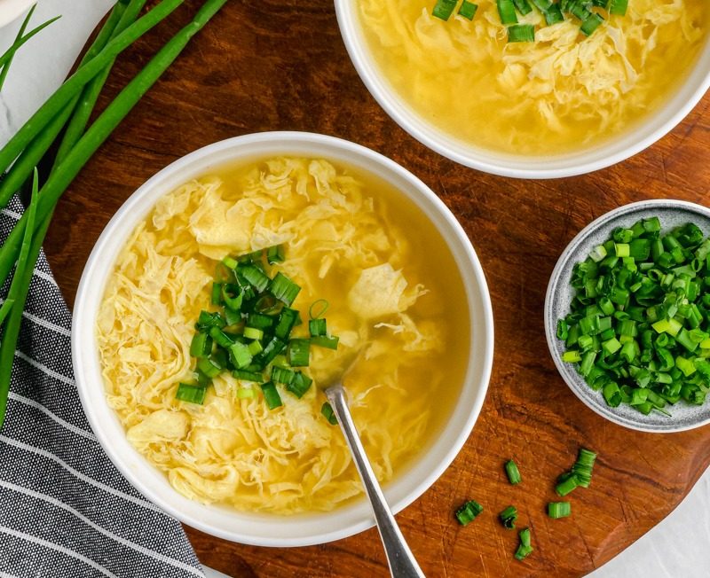 Een soep met vele namen, je kunt deze soep op menu’s vinden onder de namen eierbloemsoep, Chinese eiersoep, egg drop soup of zelfs haaienvinnensoep. Haaienvinnensoep in Nederland wordt namelijk niet echt met haaienvinnen gemaakt, en wat je geserveerd krijgt is in principe de onderstaande soep, vaak wel nog met wat extra kipsliertjes toegevoegd.