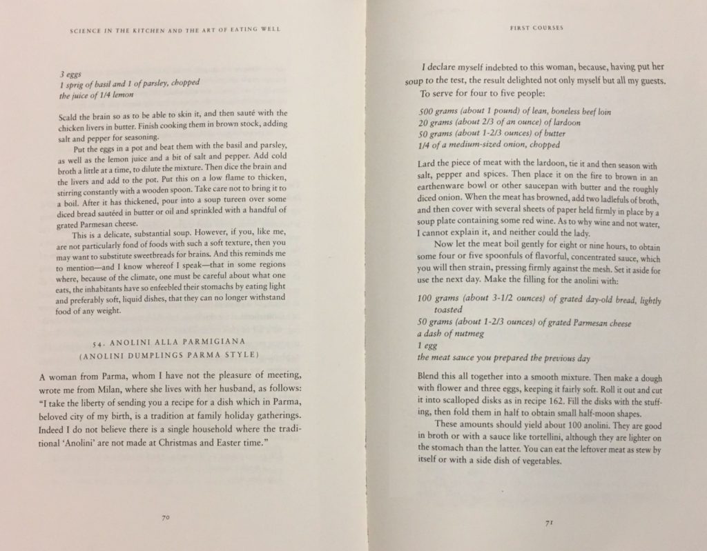 Deze verhalen, samen met de vele tijdloze recepten, maken het boek zo interessant voor de hedendaagse lezer. Elke bladzijde bevat weer een interessante anekdote, een verbazingwekkend weetje, een inspirerend verhaal of een prachtig gerecht. De relaxte manier waarop hij schrijft en de geruststellende toon zorgen ervoor dat dit boek nog steeds met heel veel plezier kan worden opgepakt door iedereen die interesse heeft in de Italiaanse keuken of Italie in zijn algemeenheid.